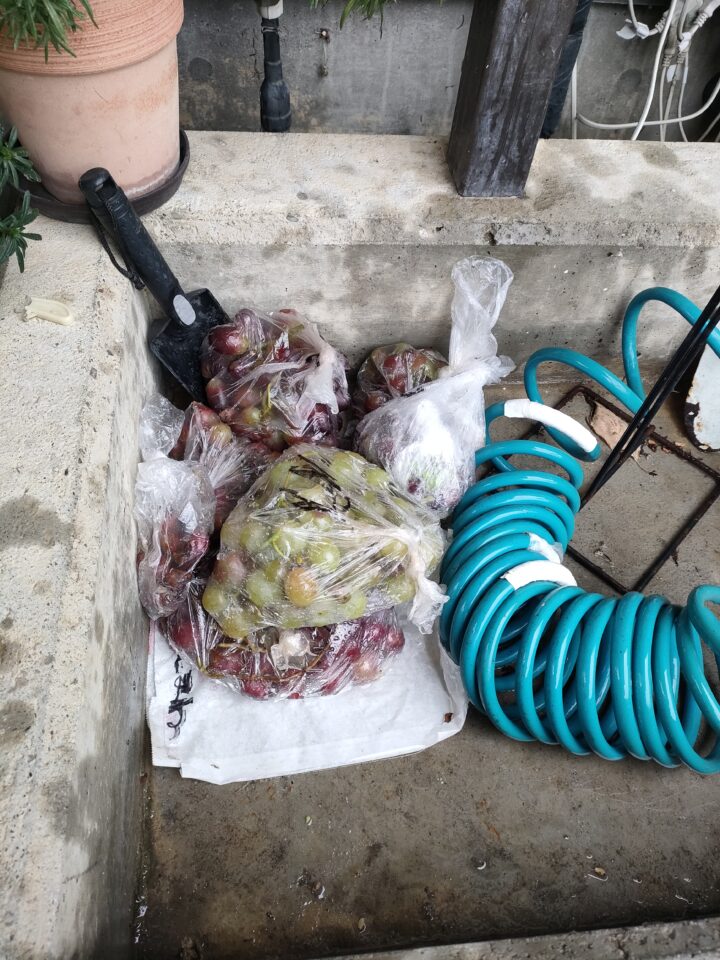 ビニールに品種を書いて、ぶどうの粒をいれて水場に